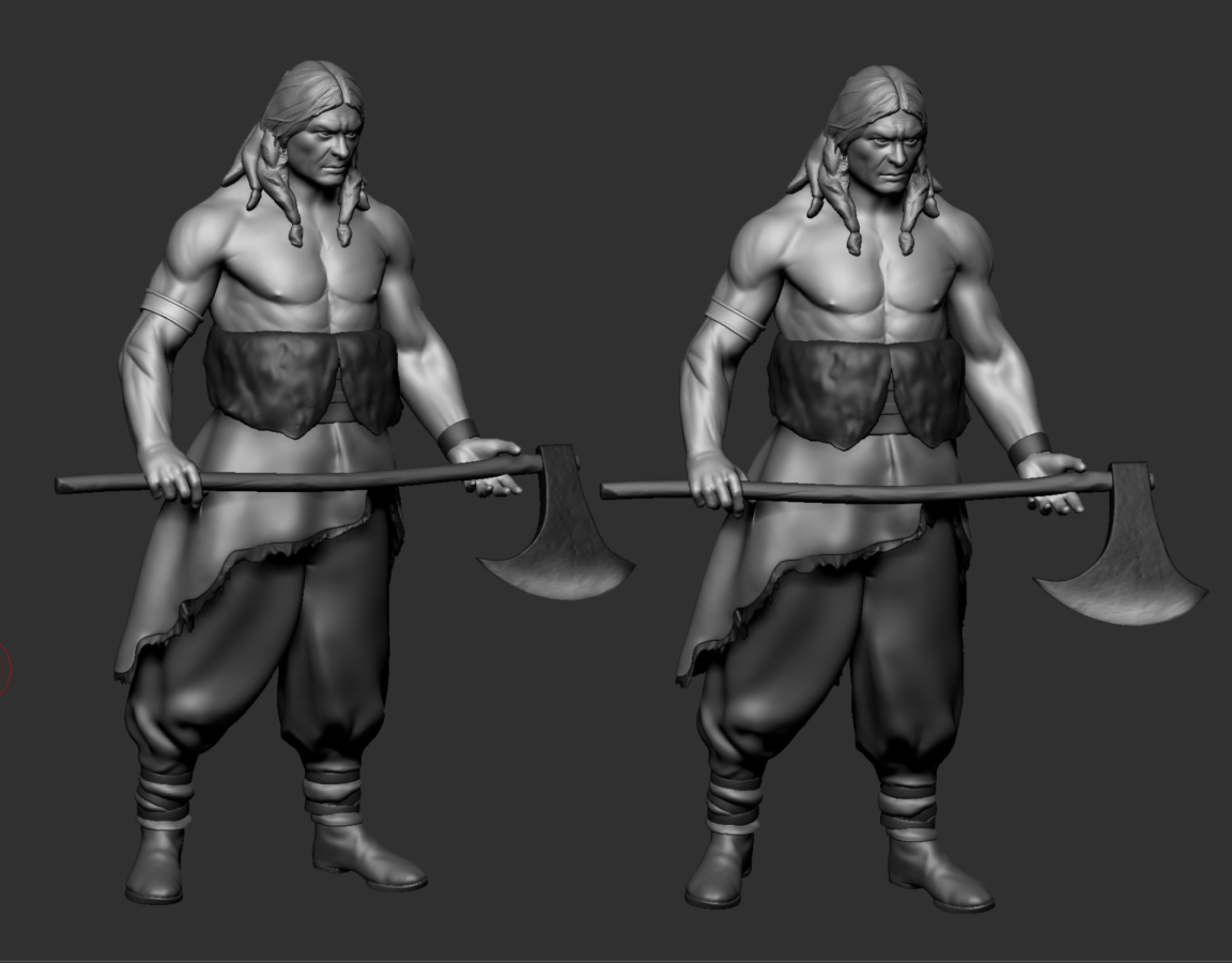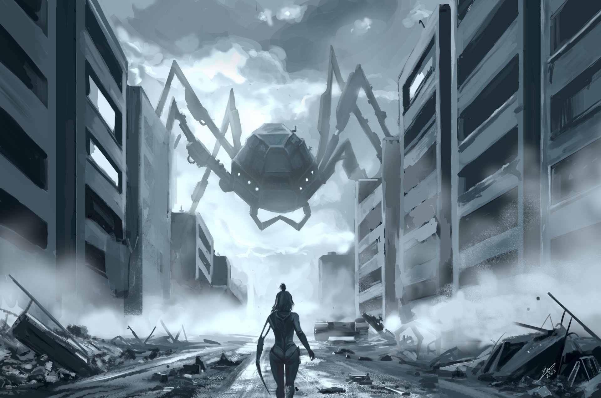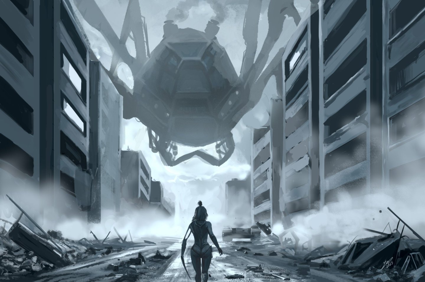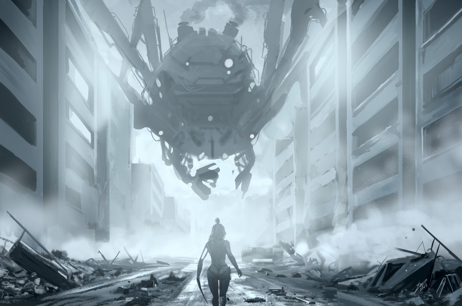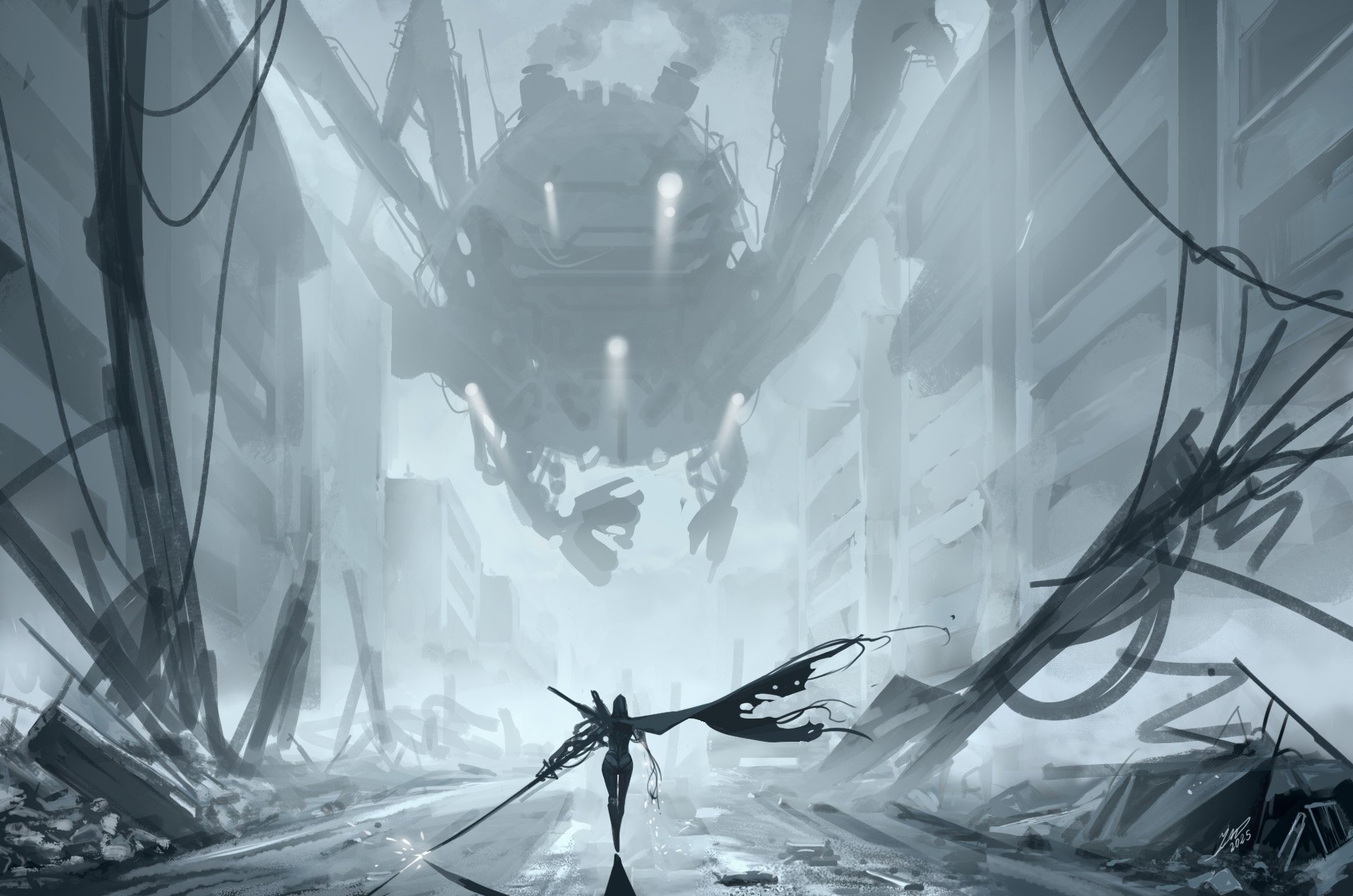 - Zurluk@Zurluk Fajnie fajnie, widać postępy ale tu i tam mi nie styka. Szczególnie jeśli chodzi o uczucie skali i przestrzeni. Według mnie jest to wypadkowa kilku rzeczy: 1. Perspektywy - budynki bardzo rozciągnięte, podobna sytuacja co wcześniej, odwołam się więc do tego co napisałem we wczesniejszym poście w tym wątku: 2. Perspektywa atmosferyczna - zarówno budynki, postać jak i robot mają podobny walor, przez co wydają się dość blisko siebie. 3. Robot jest przed budynkami. Gdyby dać go za nimi to wydawałby się znacznie większy. Połączmy więc to co napisałem w praktyce: 4. Robot jest ogólnie dość mały. To, co bardzo wzmaga wrażenie skali to wyłażenie obiektów poza kadr, tak, że widać tylko ich część. Powiększy więc robota, tak, żeby się nie mieścił w całości: Od razu gróźniejszy :) 6. Brakuje detalu na robocie. Tutaj jest to trochę problematyczne, bo im dalej obiekt jest tym mniej tego detalu widać, ale powinno być trochę takiego greeblingu (https://en.wikipedia.org/wiki/Greeble) czyli takich detali, które dodają złudzenia złożoności obiektu i przez to jego rozmiarów. Dajmu więc trochę takiego srutututu, szczególnie na obrysie 7. Postać. Jest ucięta w kadrze i nie wygląda, jakby była w środku sceny. Brakuje jej też jakiegoś, nazwijmy to tak technicznie, pierdolnięcia :) Jakiejś historii, czegoś, co by sugerowało jej zamiary czy przeszłość. Dajmy jej jakieś turbo-anime mieczoramię, ciągnące klingę po ulicy, drugą rękę urwaną i dramatycznie powiewającą podartą pelerynę. Teraz lepiej widać jakąś dramaturgię i determinację postaci idącej bez strachu wprost na gigarobota. Jeszcze jakiś dramatyczny chór żeński przyśpiewuje w tle i pyk, mamy scenę :) Gif porównawczy: To tyle ode mnie :) Pozdro!