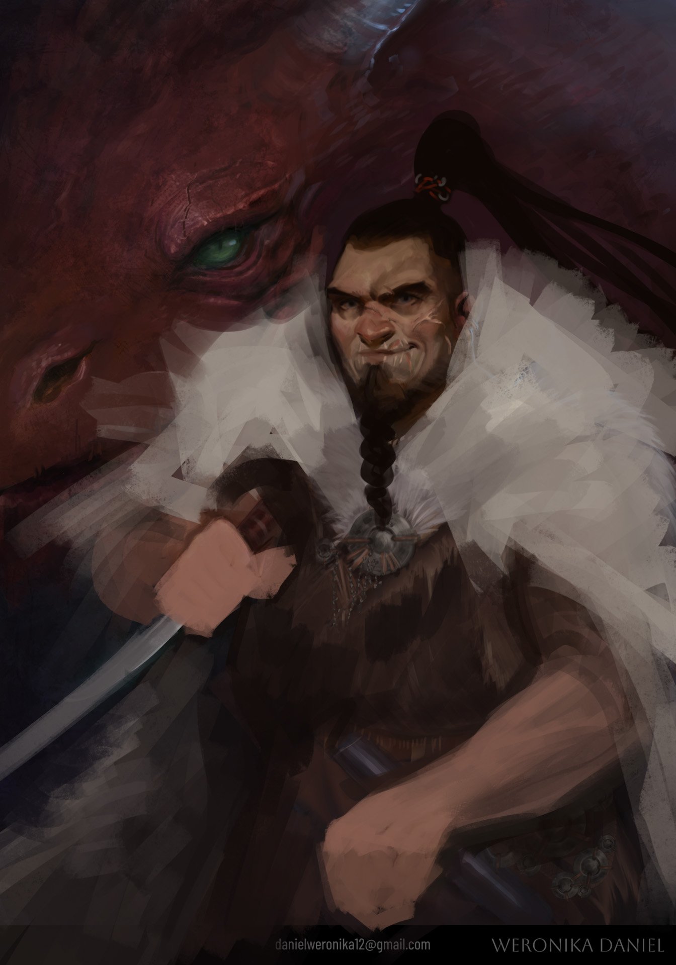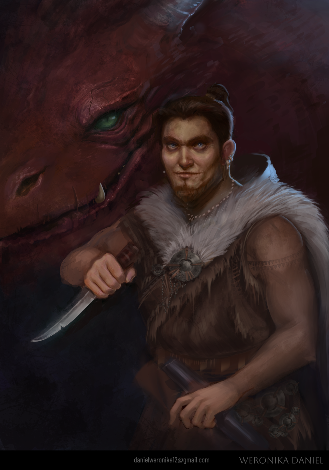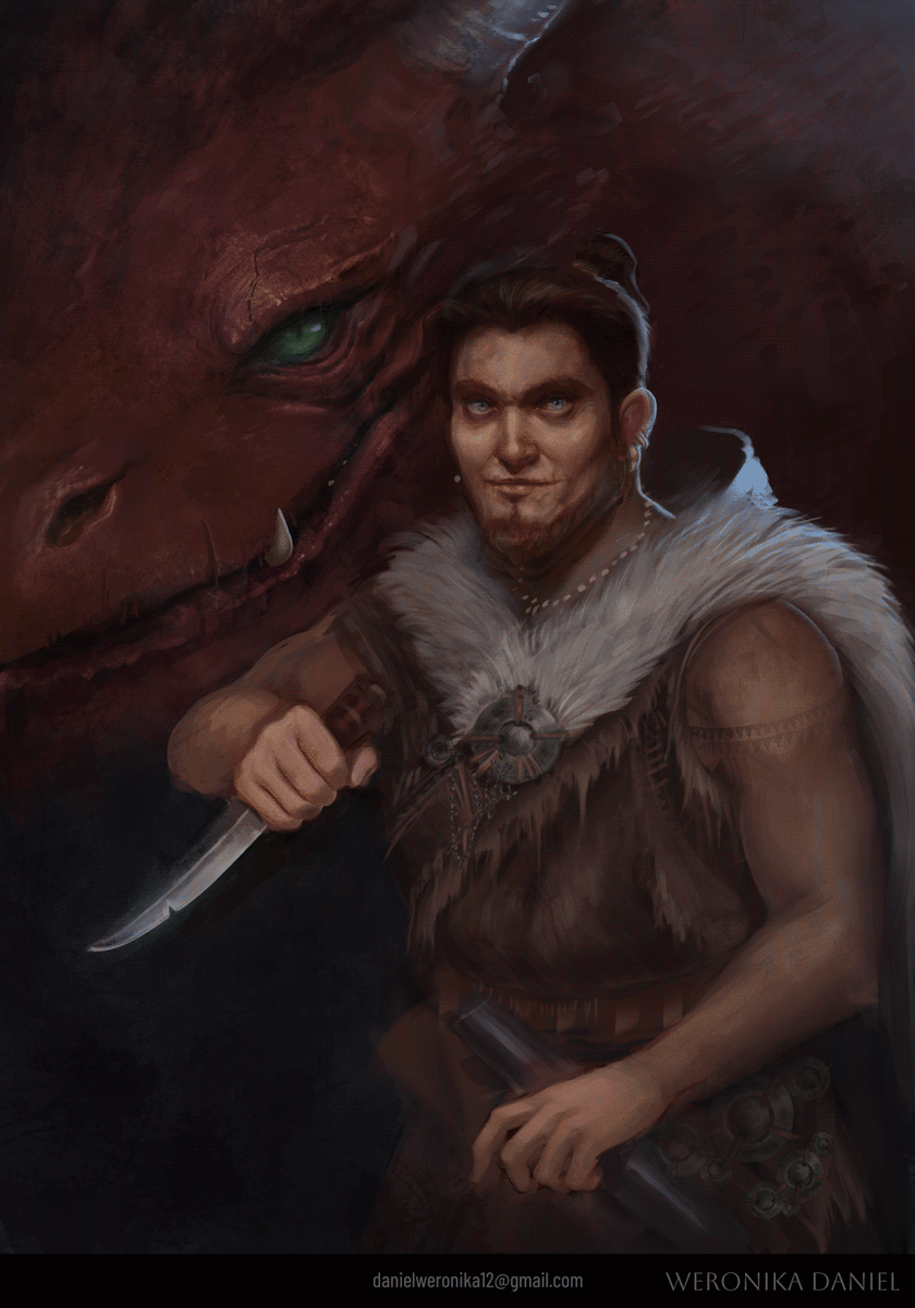 Fajnie fajnie, ale standardowo się przyp1erdzielę, jak już mnie tu @kengi zwabił, bo świat byłby zbyt piekny bez tego :] Tak raczej w kwestii samego designu postaci, szczególnie głowy. Ogólnie to przypomina mi trochę podstarzałego Davida Hasselhoffa :D Może dać mu jakis bardziej barbarzyński sznyt, w stylu niskiego, masywnego czoła, kulfoniastego nosa od miodu pitnego i dostawania w mordę, jakieś jeszcze dodatkowe blizny na ryju, bo czemu nie :) Do tego może fryz jakiś taki mongolskobarbarzyński i masywniejszą brodę? Żeby wyglądał jak jakiś dziki maderfaker (ale stylish), a nie amerykański jock? To futro to bym też jak FUTRO zrobił, bo tym puchatym szaliczkiem teraz to się ledwo na szyję nakryje i się przeziębi jak będzie latał na smoku :( A babcia mówiła: lataj nisko i powoli! Rąsie zbyt małe i takie delikatne. Jak to jakiś jeźdźca smoków to pewnie ma przedramiona jak Popeye od trzymania smoko-lejców i +1d6 crushing damage przy podawaniu ręki. Niech ma takie męskie chleby. Taki mały overpaint, might delete later idk Tak serio to tylko taka moja wizja tej postaci i czego bym się po niej spodziewał, niekoniecznie od razu lepsza. Dobrze mieć jakąś historię postaci i ją wizualnie pokazac, ale to wiesz. Po prostu popchnąłbym design w bardziej dzikie rejony. edit: Jeszcze gif porównawczy