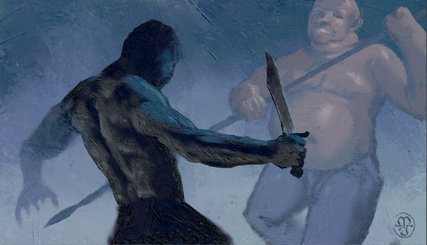 Znalazłem kilka refek, tak żeby wesprzeć się podczas szkicowania, skupiłem się na anatomii, dodaniu nakładających się form, tak żeby dookreślić przestrzeń. Proces line artu jest dla mnie wielowarstwowy, po poprawki nanosze na kolejnych warstwach, gdzie poprzednia jest widoczna jak kalka, rysuję i wymazuję, pomiędzy etapami dodałem jeszcze walorowe formy pod spód, tak żeby zainspirować się do dalszego line artu, nie używam białego do tła, za duży kontrast.