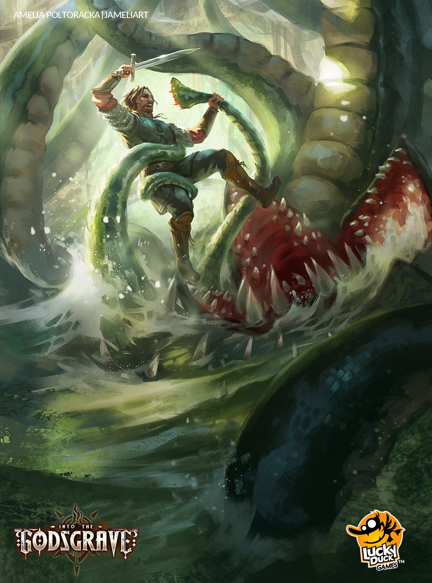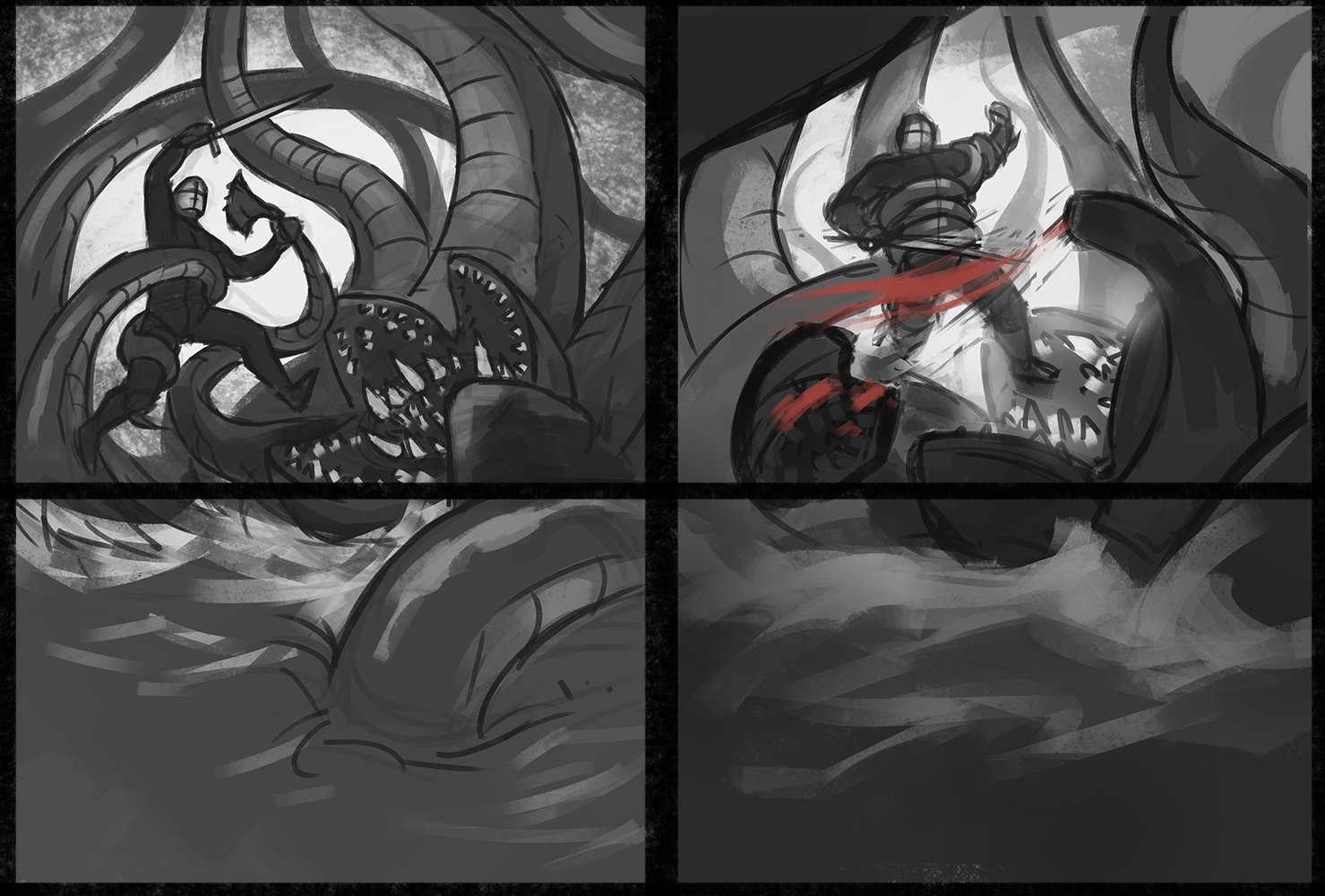 Była prośba o wrzuceniu procesów, więc zacznę po jednym bo tutaj dużo na raz nie zmieszczę ze względu na ograniczenia do 5mb. No więc proces do Unwavering Courage. Zapomniałam nagrywać więc tylko etapy :) Do zwierzaków mam nagrane malowanie to powrzucam na dniach. Zaczęłam od szkiców kompozycji. Został wybrany ten po lewo z lekką modyfikacją. 3d - postać ustawiona w Daz, przeniesiona do Blendera przy pomocy Diffeomorphic. Tam zrobiłam proste macki, paszczę. Nie bawiłam się w detale i materiały, bo tyle mi wystarczyło do ilustracji. Po zaakceptowaniu 3d etap pierwszy malowania: I końcowe detale: Na Artstation mam jeszcze gif z procesu ale nie mieści mi się tutaj bo to 10 mb więc daję linka: https://www.artstation.com/artwork/gRKKvL?notification_id=7110263851