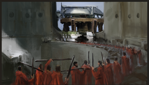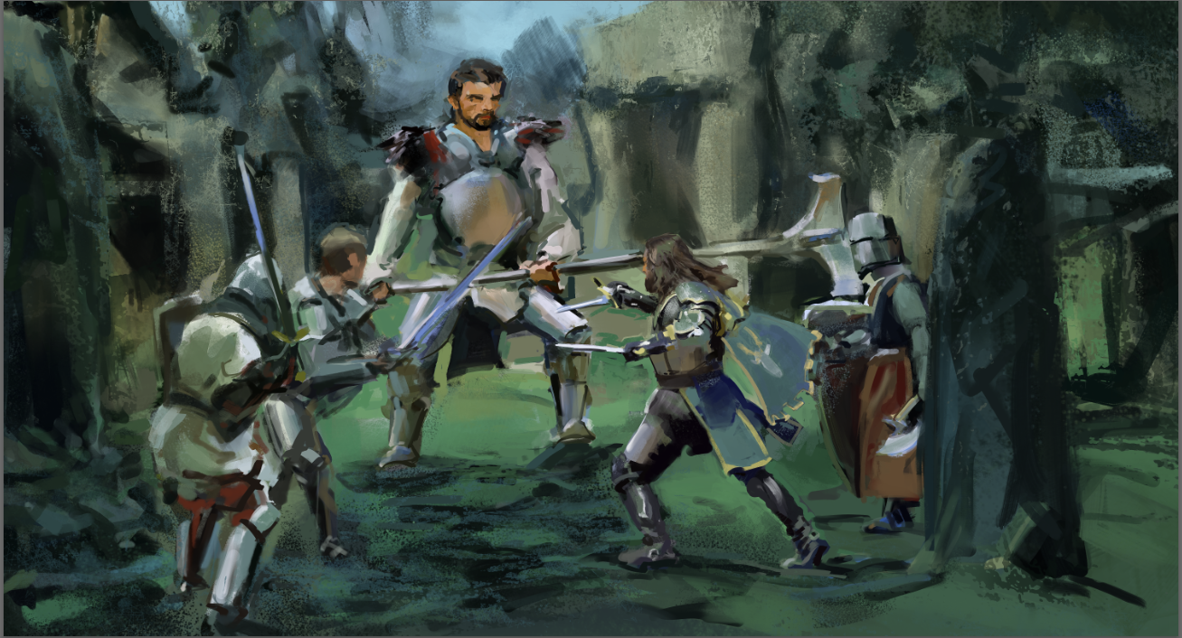 Dzięki Panowie, bardzo mi miło, postaram się nie zawieść :) Przemalowany render z UE5, wraz z bazą i kolejny walorowy w klimacie średniowiecznym. Proces wyglądał podobne jak w przypadku poprzednich- z renderu przeszedłem w walorowy szkic, potem kolor i Rebelle, na koniec dopracowanie w PS. Dołączam jeszcze BW szkic do orientalnego bazaru. Udanego czwartku.