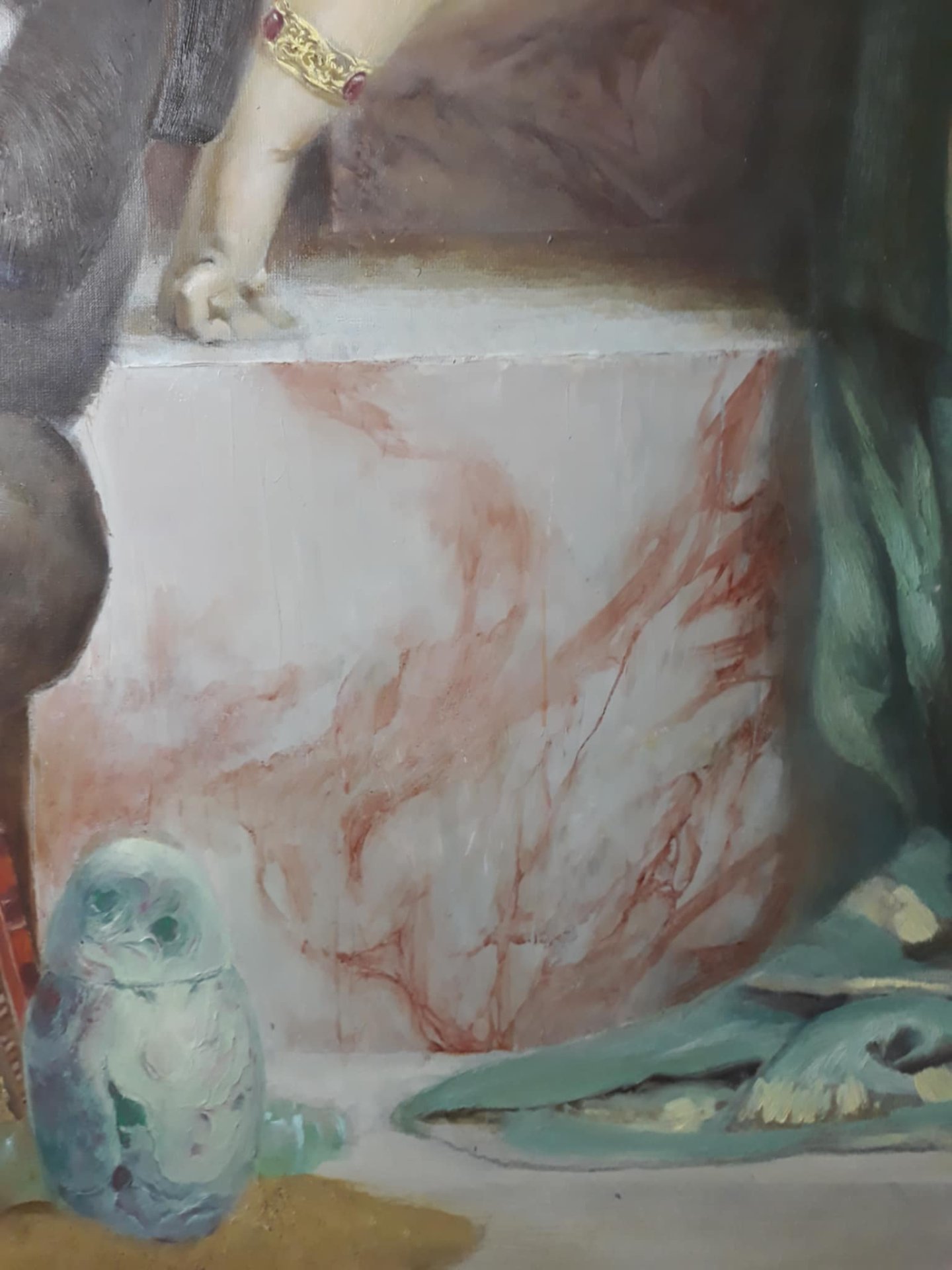 Jeśli chodzi o rekonstrukcje obrazu "Sprzedaż amuletów" Siemiradzkiego to prace poszły do przodu. Zostało wykonane podobrazie, poprawiony został szkic kolorystyczny i zrobione zostało studium portretu. Siemiradzki zazwyczaj wybierał lniane płótno o splocie prostym. W jego obrazach zaprawa przeważnie była olejna, cienka i kładziona w jednej warstwie. Dren płótna był delikatnie wyczuwalny. Kolor zaprawy w podobraziach zazwyczaj był biały lub delikatnie kremowy. Praktycznie nie używał ciemniejszych zapraw. Siemiradzki zazwyczaj kupował fabrycznie zagruntowane płótno i sam nabijał je na krosna. Skład zrobionej przeze mnie zaprawy: Kreda i biel cynkowa w stosunku 1:1, biel ołowiowa, olej lnieniany i pokost lniany by przyspieszyć proces polimeryzacji oleju. Pewnie jeszcze trochę posiedzę nad portretem.- Rjab
