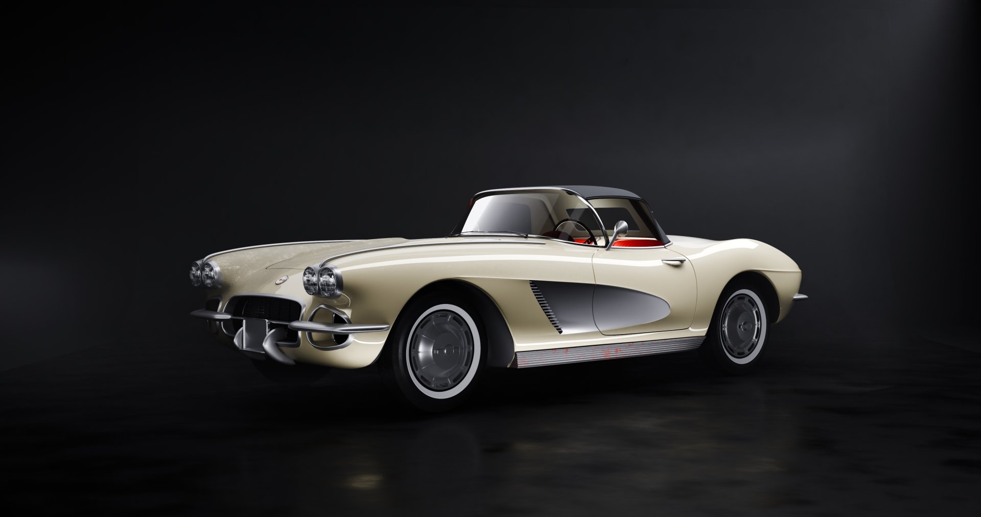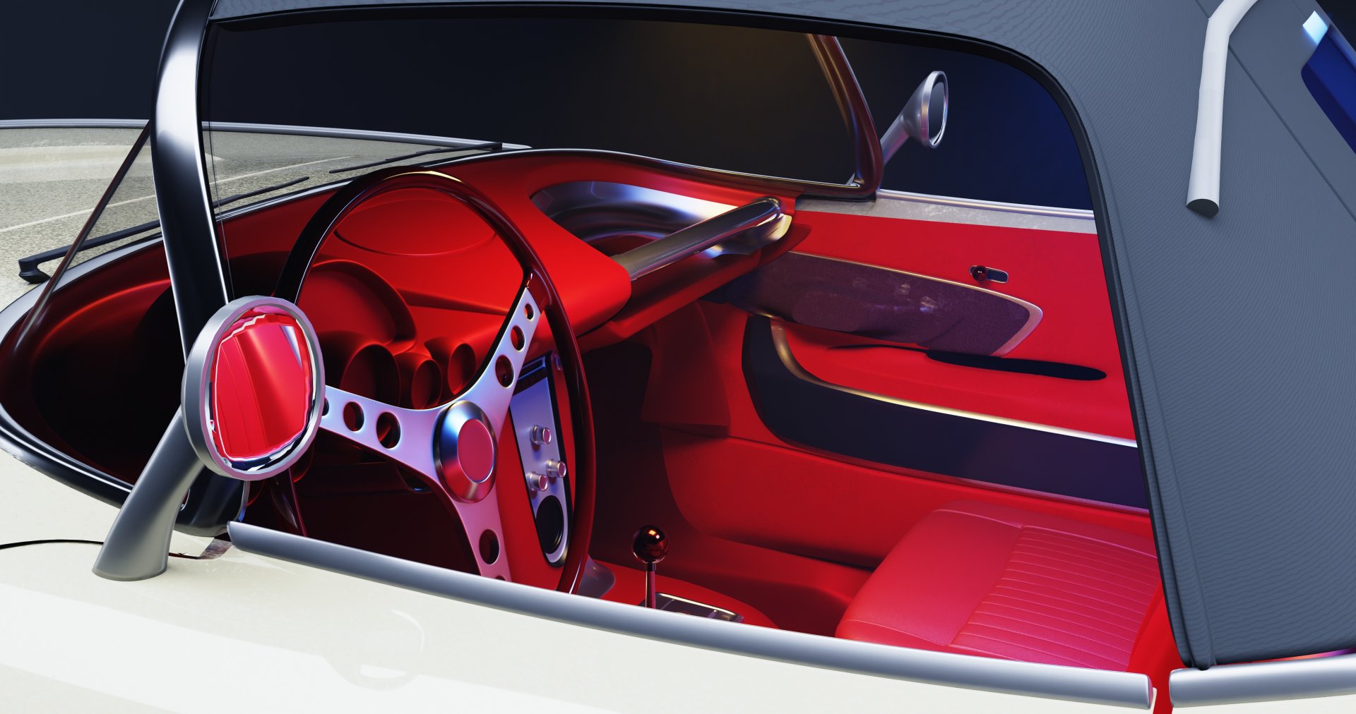 Wlasnie ten kierunek pozostawiam- ciemne tlo, ladne refleksy i softboxy highlighty. Dodam, ze chce troche dodac detali do tej corvetty, zaczalem od dachu z materialu( ta corvetka to taki mieszaniec roznych rocznikow, latwo mozna to zobaczyc), chce jeszcze dodac loga, wycieraczki, napisy i wnetrze jakies dorobic lekkie. Dobra, szyba poprawiona, lakier ciut bardziej jaskrawy : [img]